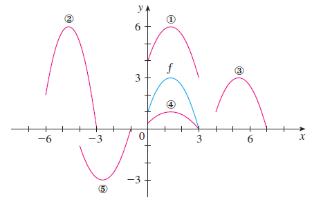 연습문제1. 아래의 그림에서 $y = f(x)$가 주어졌을 때 (a). $y = f(x - 4)$, (b). $y = f(x) + 3$, (c). $y = \frac{1}{3}f(x)$, (d). $y = -f(x + 4)$, (e). $y = 2f(x + 6)$과 1 ~ 5번의 그래프를 서로 맞추어라.