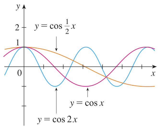 이를 삼각함수 그래프로 생각해보도록 하겠습니다. $\cos{x}$와 $\cos{2x}$, $\cos{\frac{1}{2}x}$를 비교해보세요. $\cos{2x}$는 $\cos{x}$에 비해서 주기($2\pi \rightarrow \pi$)가 더 빨라졌습니다. 그와는 대조적으로 $\cos{\frac{1}{2}x}$는 주기($2\pi \rightarrow 4\pi$)가 더 느려졌습니다.