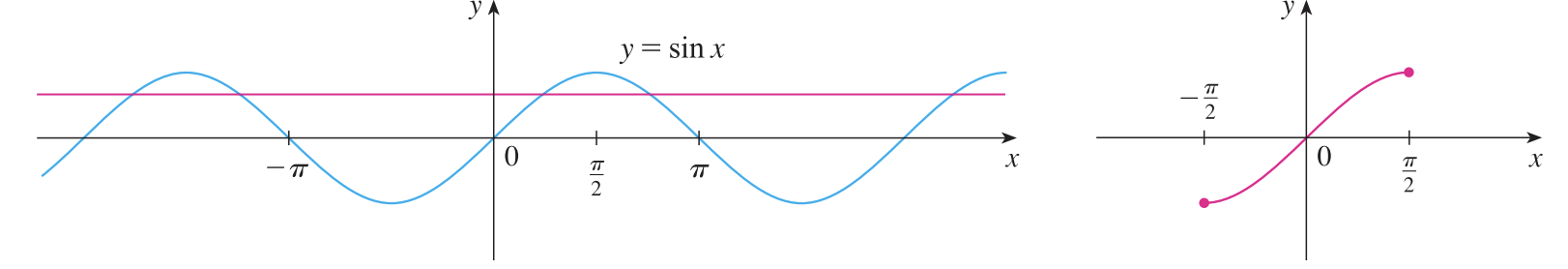 예를 들어 $\sin(x)$는 왼쪽과 같은 함수입니다. 그리고 수평선 검사를 해보면 1개의 함숫값에 대해서 무한 개의 값이 대응하게 됩니다. 이 상황에서는 역함수 자체를 정의할 수 없기 때문에 정의역의 범위를 $[-\frac{\pi}{2}, \frac{\pi}{2}]$로 제한합니다. 그러면 오른쪽 그림과 같이 일대일 대응 함수가 만들어지게 됩니다. 이를 기호로 표현하면 $\arcsin(x) = \sin^{-1}(x)$가 됩니다. 이와 유사한 방법으로 $\cos(x)$는 $[0, \pi]$, $\tan(x)$는 $[-1, 1]$까지 정의역을 제한하면 역함수 $\arccos(x) = \cos^{-1}(x)$와 $\arctan(x) = \tan^{-1}(x)$를 얻을 수 있습니다.