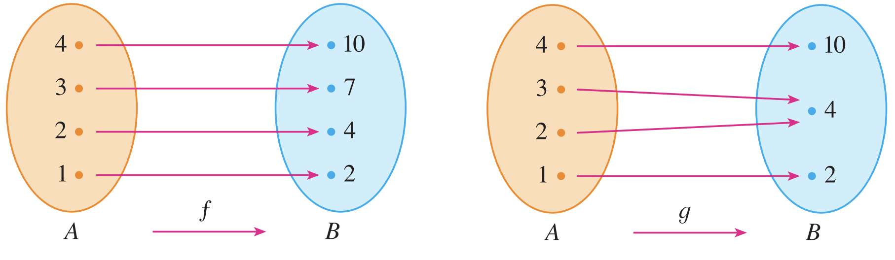 위의 그림에서 $f$는 일대일 대응 함수이고 $g$는 아닙니다. 왼쪽 그림은 모든 $A$의 원소가 $B$의 원소에 전부 다르게 대응됩니다. 하지만 오른쪽 그림에선느 $g(2) =g(3) = 4$이기 때문에 일대일 대응이 아닙니다.
