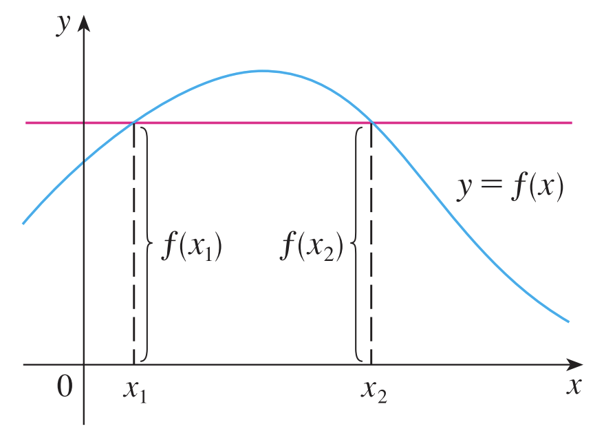 위의 그림에서 어떠한 $x$도 두 점에서 만나지 않기 때문에 $f(x)$는 일대일 대응 함수이다.