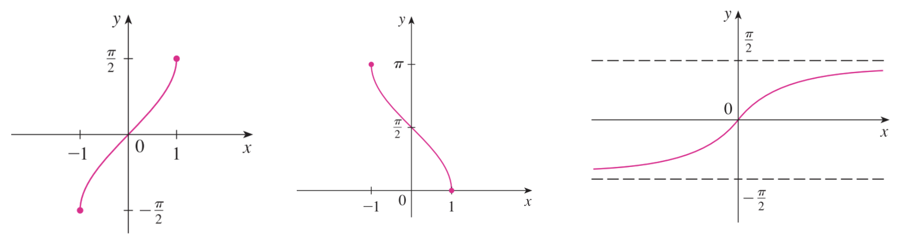 위 그림은 오른쪽부터 $\arcsin(x), \arccos(x), \arctan(x)$ 함수를 의미합니다. 기존의 함수와 정확히 $y = x$ 대칭임을 확인할 수 있습니다.