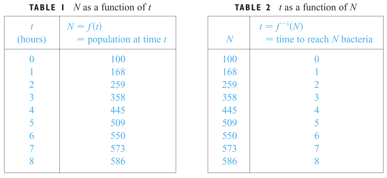 역함수를 설명하기 위해서 위의 표를 이용해보도록 하겠습니다. 왼쪽 표는 시간에 따른 박테리아 수를 나타낸 것입니다. $t = 0$일 때는 $f(0) = 100$마리의 박테리아가 있음을 의미합니다. 이제 궁금한 것은 만약 박테리아가 400마리 정도 있을 때 배양한지 몇 시간 째 지났는 지 알고 싶습니다. 이를 오른쪽 표를 통해서 보도록 하죠. 오른쪽 표는 박테리아 수에 따른 시간을 표현한 것 입니다. 예를 들어 박테리아가 550마리 정도 있다면 6시간 정도 지났다고 볼 수 있습니다. 두 표 사이의 차이점은 열이 뒤바뀐것 뿐입니다. 왼쪽 표는 시간을 기준으로, 오른쪽 표는 박테리아 수를 기준으로 표현하고 있습니다. 왼쪽 표를 $f(t) = N$이라고 했을 때, 오른쪽 표는 $f^{-1}(N) = t$라고 표현할 수 있습니다. 다시 돌아와서 저희가 400마리의 박테리아가 있을 때 어느 정도의 시간이 지났는 지 구하는 것은 $f^{-1}(400)$을 구하는 것과 동일합니다. 하지만 오른쪽 표에서는 $f^{-1}(400)$이 없기 때문에 $f^{-1}(358)$과 $f^{-1}(445)$의 평균을 고려하면 약 3시간 30분 정도 흘렀다는 것을 알 수 있습니다.