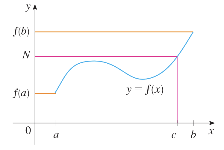 $f$가 닫힌 구간 $[a, b]$에서 연속이고 $N$을 $f(a)$와 $f(b)$ 사이의 임의의 숫자라고 가정하면(이때, $f(a) \neq f(b)$이다.) $f(c) = N$을 만족하는 $c$가 열린 구간 $(a, b)$에 존재한다.