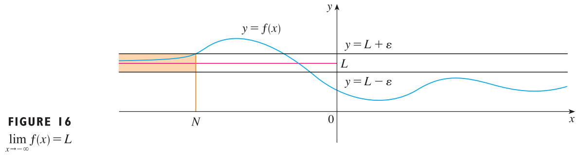 $f$를 어떤 구간 $(-\infty, a)$에서 정의된 함수라고 가정하자. 그러면 $\lim_{x \rightarrow -\infty} f(x) = L$은 임의의 $\epsilon > 0$에 대해서 $x < N$일 때 $|f(x) - L| < \epsilon$을 만족하는 수 $N$이 존재하는 것이다.