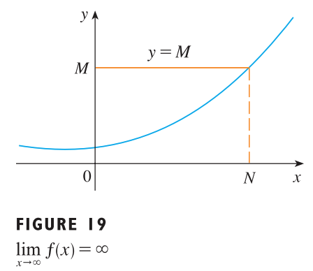 $f$를 어떤 구간 $(a, \infty)$에서 정의된 함수라고 가정하자. 그러면 $\lim_{x \rightarrow \infty} f(x) = \infty$은 임의의 양의 실수 $M$에 대해서 $x > N$일 때 $f(x) > M$을 만족하는 수 $N$이 존재하는 것이다.