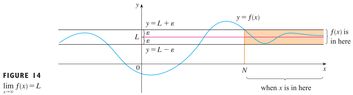 $f$를 어떤 구간 $(a, \infty)$에서 정의된 함수라고 가정하자. 그러면 $\lim_{x \rightarrow \infty} f(x) = L$은 임의의 $\epsilon > 0$에 대해서 $x > N$일 때 $|f(x) - L| < \epsilon$을 만족하는 수 $N$이 존재하는 것이다.