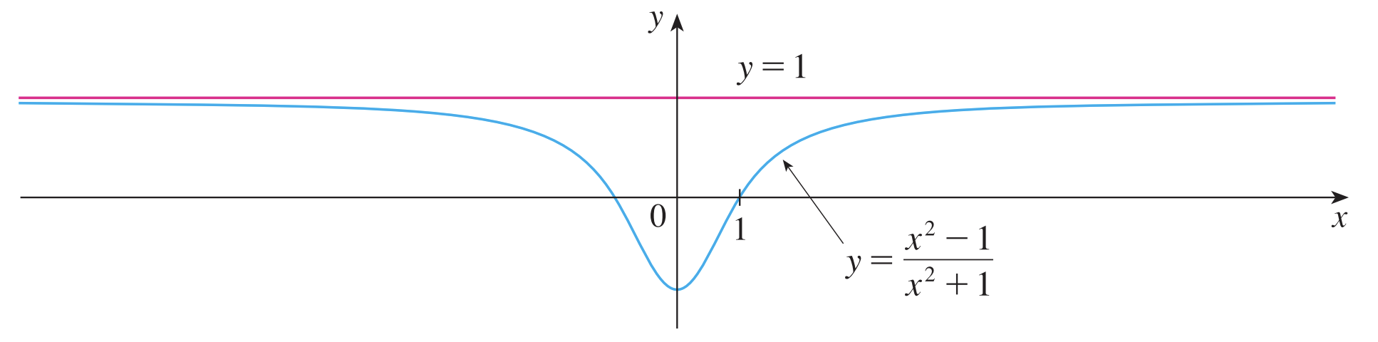 위의 그림들은 $x \rightarrow \infty$일 때 $y = L$로 접근하는 다양한 예시들을 보여주고 있습니다. 이때, $y = L$은 "수평점근선(horizontal asymptote)"라고 합니다. 따라서 $f(x) = \frac{x^{2} - 1}{x^{2} + 1}$의 수평점근선은 $y = 1$입니다.