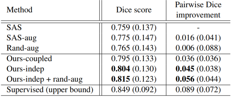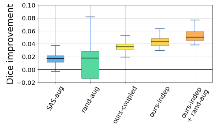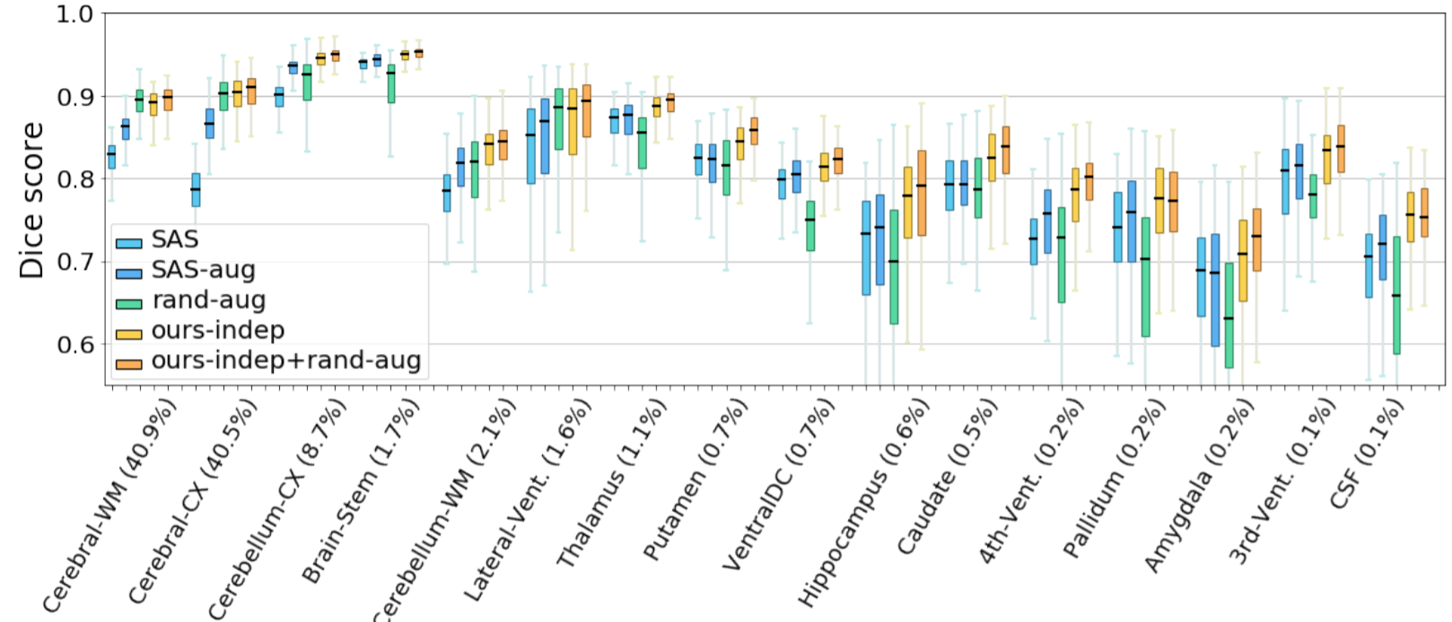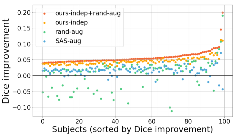 이 그림은 30개의 해부학적 label에 대한 SAS 방법과 비교해서 얼마나 향상되었는 지를 mean Dice score를 기준으로 나타낸것입니다. 하지만 rand-aug의 성능이 가장 높을 때가 있었습니다. 그러나 평균적으로 봤을 때 rand-aug는 본 논문에서 제안하는 방법에 비해서 일관적이지 않다라고 볼 수 있습니다. 왜냐하면 rand-aug의 평균이 다른 기법에 비해서 낮기 때문이지요.