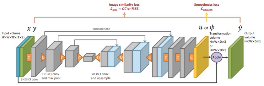 이때 spatial transformation은 voxel 별로 displacement field $u$의 형태로 얻어지게 됩니다. 간단하게 vector field의 형태로 나온다고 보면 될 것 같습니다. 그럼 $\tau_{s}(\cdot)$은 atlas $x$와 unlabeled $y$사이의 spatial difference가 나오게 됩니다. 즉, atlas $x$를 적당한 registration을 통해서 unlabeled dataset에 있는 해부학적 특성에 맞도록 바꿔주는 역할을 하게 되는 것이죠.