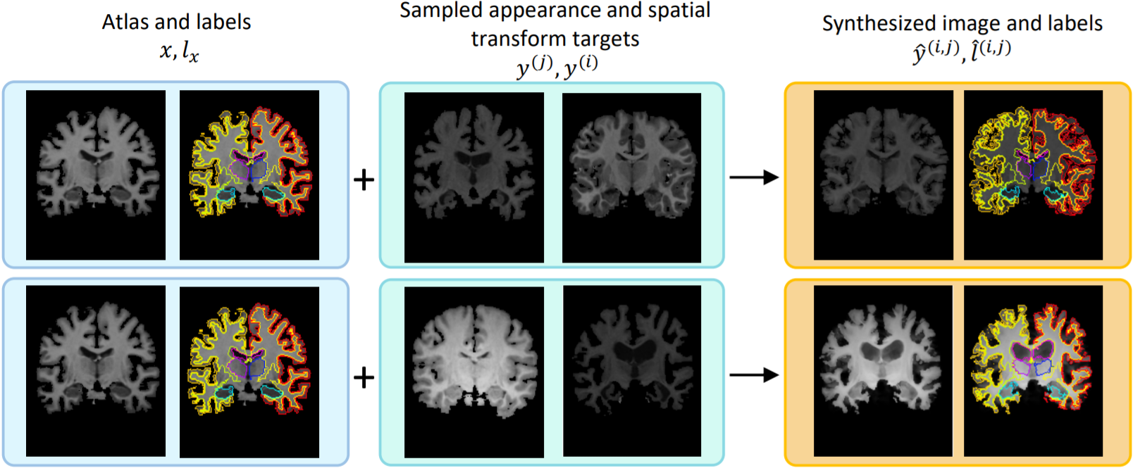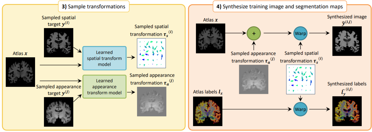 그리고 학습된 transform model들을 이용해서 label이 있는 volume을 합성하게 됩니다. 먼저 spatial transform model와 appearance transform model을 사용해서 atlas volume에 적용한 뒤 얻는 $\hat{y}^{(k)}$와 spatial transform model만 적용해서 얻는 $\hat{l}^{(k)}_{y}$을 통해 새로운 label이 있는 dataset으로 $(\hat{y}^{(k)}, \hat{l}^{(k)}_{y})$을 얻게 됩니다.