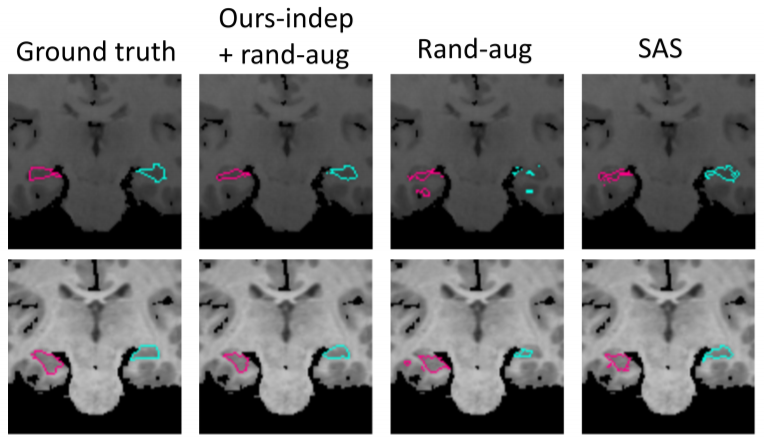 이 그림은 뇌의 해마 부분을 2개의 test subgect에 대해서 segment한 예시입니다. 맨 왼쪽이 Ground Truth인데 실제로 작은 해부학적 구조를 가지는 해마를 rand-aug는 부적합한 것을 볼 수 있습니다. 하지만 두번째 열을 보면 본 논문에서 제시한 방법과 rand-aug를 함께 사용한 결과가 휠씬 적합한 것을 볼 수 있습니다.