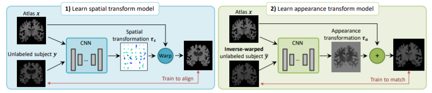 먼저, spatial tranform model과 appearance transform model를 각각 학습합니다. 이때 spatial transform model은 label이 되있는 atlas volume와 label이 없는 volume 사이의 해부학적 차이를 capture하고 appearance transform model은 label이 되있는 atlas volume와 label이 없는 volume 사이의 appearance의 차이를 capture하게 됩니다. 이때 appearance란 intensity로 동일한 의미로 사용할 수 있습니다.
