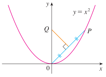 종합연습문제4. 아래와 같은 그림이 주여졌을 때 점 $P$가 포물선을 따라 원점으로 향할 때 점 $Q$를 구하여라.
