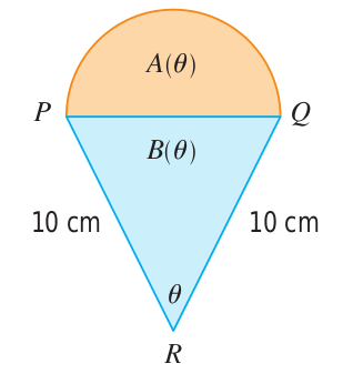 이등변삼각형의 꼭지점 $R$에서 선분 $PQ$로의 수선의 발을 $M$이라고 할 때 두 선분 $PQ$와 $RM$은 서로 수직이므로 삼각비의 정의에 의해 반원의 반지름은 $10\sin\left(\frac{\theta}{2}\right)$임을 알 수 있다. 따라서, $A(\theta) = \left(10\sin\left(\frac{\theta}{2}\right)\right)^{2} \pi \frac{1}{2} = 50\pi\sin^{2}\left(\frac{\theta}{2}\right)$이다.
