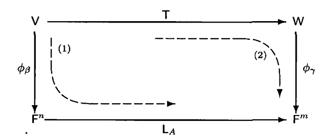 $$\begin{cases} &(\phi_{\gamma} \circ T)(v_{j}) = \phi_{\gamma}(T(v_{j})) = \phi\left(\sum_{i = 1}^{n} A_{ij}w_{i}\right) = Ae_{j} \\ &(L_{A} \circ \phi_{\beta})(v_{j}) = L_{A}(\phi_{\beta}(v_{j})) = L_{A}(e_{j}) = Ae_{j} \end{cases}$$