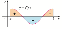 따라서, 적분은 위와 같이 곡선의 밑넓이를 구하는 것으로 해석할 수 있습니다. 하지만, 만약에 $f(x) < 0$인 구간이 있다면 어떤 식으로 받아들어야 할까요?