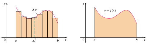 $$\int_{a}^{b} f(x) dx = \lim_{n \rightarrow \infty} \sum_{i = 1}^{n} f(x_{i}^{*}) \Delta x$$