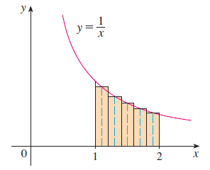 $$\begin{align*} \int_{1}^{2} \frac{1}{x} \; dx &\approx \sum_{i=1}^{5} f(x_{i}) \Delta x \\ &= \frac{1}{5} \left[f(x_{1}) + f(x_{2}) + f(x_{3}) + f(x_{4}) + f(x_{5})\right] \approx 0.6456 \end{align*} $$