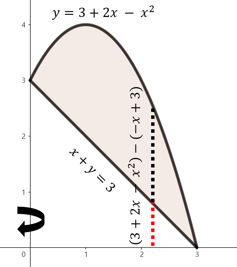 주어진 함수로 둘러쌓인 영역을 그림으로 그리면 위와 같이 그릴 수 있다. 여기서, 점 $x$에서 $y$축을 기준으로 회전했을 때 얻을 수 있는 회전체 단면의 높이는 $\left( 3 + 2x - x^{2} \right) - \left( -x + 3 \right) = 3x - x^{2}$이다. 이제, 구간 $0 \le x \le 3$에서 주어진 영역을 $y$축으로 회전시켰을 때 얻을 수 있는 회전체의 부피를 실린더 방법을 이용해 다음과 같이 구할 수 있다.