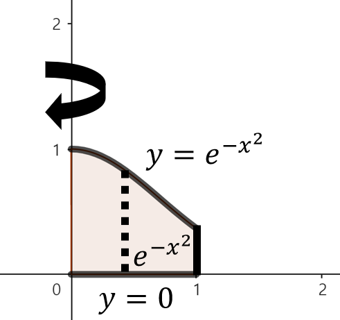 주어진 함수로 둘러쌓인 영역을 그림으로 그리면 위와 같이 그릴 수 있다. 여기서, 점 $x$에서 $y$축을 기준으로 회전했을 때 얻을 수 있는 회전체 단면의 높이는 $e^{-x^{2}}$이다. 이제, 구간 $0 \le x \le 1$에서 주어진 영역을 $y$축으로 회전시켰을 때 얻을 수 있는 회전체의 부피를 실린더 방법을 이용해 다음과 같이 구할 수 있다.
