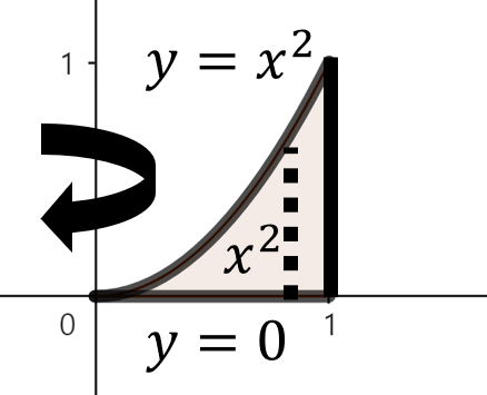 주어진 함수로 둘러쌓인 영역을 그림으로 그리면 위와 같이 그릴 수 있다. 여기서, 점 $x$에서 $y$축을 기준으로 회전했을 때 얻을 수 있는 회전체 단면의 높이는 $x^{2}$이다. 이제, 구간 $0 \le x \le 1$에서 주어진 영역을 $y$축으로 회전시켰을 때 얻을 수 있는 회전체의 부피를 실린더 방법을 이용해 다음과 같이 구할 수 있다.