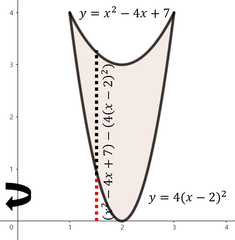 주어진 함수로 둘러쌓인 영역을 그림으로 그리면 위와 같이 그릴 수 있다. 여기서, 점 $x$에서 $y$축을 기준으로 회전했을 때 얻을 수 있는 회전체 단면의 높이는 $\left( x^{2} - 4x + 7 \right) - \left( 4(x - 2)^{2} \right) = -3x^{2} + 12x - 9$이다. 이제, 구간 $1 \le x \le 3$에서 주어진 영역을 $y$축으로 회전시켰을 때 얻을 수 있는 회전체의 부피를 실린더 방법을 이용해 다음과 같이 구할 수 있다.
