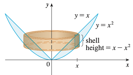 $x = x^{2}$이라고 했을 때, 두 곡선은 $x = 0, x = 1$에서 만난다. 그리고, $x$를 반지름이라고 할 때, 실린더의 높이는 두 곡선의 높이차와 동일하기 때문에 $h = x - x^{2}$이다. 따라서, 회전체의 부피는 아래와 같다.