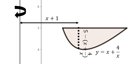 주어진 함수로 둘러쌓인 영역을 그림으로 그리면 위와 같이 그릴 수 있다. 여기서, 점 $x$에서 $x = -1$축을 기준으로 회전했을 때 얻을 수 있는 회전체 단면의 높이는 $5 - \left(x + \frac{4}{x}\right)$이다. 이제, 구간 $1 \le x \le 4$에서 주어진 영역을 $x = -1$축으로 회전시켰을 때 얻을 수 있는 회전체의 부피를 실린더 방법을 이용해 다음과 같이 구할 수 있다.