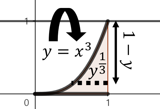주어진 함수로 둘러쌓인 영역을 그림으로 그리면 위와 같이 그릴 수 있다. 여기서, 점 $y$에서 $y = 1$축을 기준으로 회전했을 때 얻을 수 있는 회전체 단면의 높이는 $1 - y^{\frac{1}{3}}$이다. 이제, 구간 $0 \le y \le 1$에서 주어진 영역을 $y = 1$축으로 회전시켰을 때 얻을 수 있는 회전체의 부피를 실린더 방법을 이용해 다음과 같이 구할 수 있다.