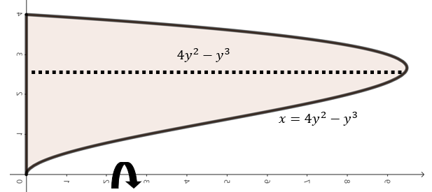 주어진 함수로 둘러쌓인 영역을 그림으로 그리면 위와 같이 그릴 수 있다. 여기서, 점 $y$에서 $x$축을 기준으로 회전했을 때 얻을 수 있는 회전체 단면의 높이는 $4y^{2} - y^{3}이다. 이제, 구간 $0 \le y \le 4$에서 주어진 영역을 $x$축으로 회전시켰을 때 얻을 수 있는 회전체의 부피를 실린더 방법을 이용해 다음과 같이 구할 수 있다.