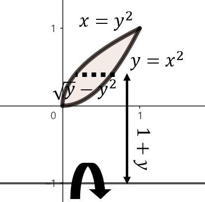 주어진 함수로 둘러쌓인 영역을 그림으로 그리면 위와 같이 그릴 수 있다. 여기서, 점 $y$에서 $y = -1$축을 기준으로 회전했을 때 얻을 수 있는 회전체 단면의 높이는 $\sqrt{y} - y^{2}$이다. 이제, 구간 $0 \le y \le 1$에서 주어진 영역을 $y = -1$축으로 회전시켰을 때 얻을 수 있는 회전체의 부피를 실린더 방법을 이용해 다음과 같이 구할 수 있다.