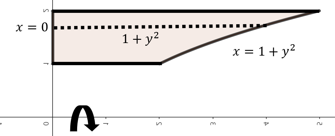 주어진 함수로 둘러쌓인 영역을 그림으로 그리면 위와 같이 그릴 수 있다. 여기서, 점 $y$에서 $x$축을 기준으로 회전했을 때 얻을 수 있는 회전체 단면의 높이는 $1 + y^{2}$이다. 이제, 구간 $1 \le y \le 2$에서 주어진 영역을 $x$축으로 회전시켰을 때 얻을 수 있는 회전체의 부피를 실린더 방법을 이용해 다음과 같이 구할 수 있다.