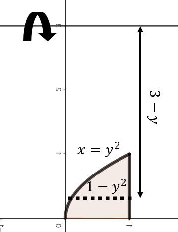 $x = y^{2}, x = 1, y = 0, y = 1$으로 둘러쌓인 영역을 $y = 3$축을 중심으로 회전한 회전체의 부피를 의미한다.