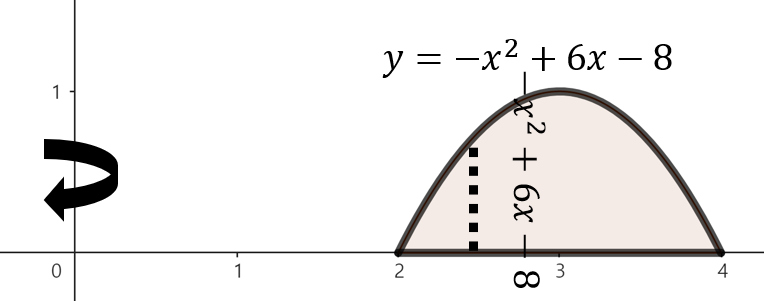 주어진 함수로 둘러쌓인 영역을 그림으로 그리면 위와 같이 그릴 수 있다. 여기서, 점 $x$에서 $y$축을 기준으로 회전했을 때 얻을 수 있는 회전체 단면의 높이는 $-x^{2} + 6x - 8$이다. 이제, 구간 $2 \le x \le 4$에서 주어진 영역을 $y$축으로 회전시켰을 때 얻을 수 있는 회전체의 부피를 실린더 방법을 이용해 다음과 같이 구할 수 있다.
