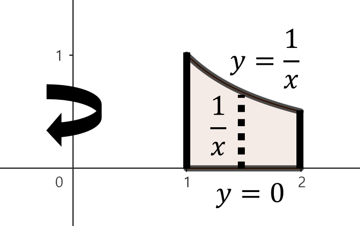 주어진 함수로 둘러쌓인 영역을 그림으로 그리면 위와 같이 그릴 수 있다. 여기서, 점 $x$에서 $y$축을 기준으로 회전했을 때 얻을 수 있는 회전체 단면의 높이는 $\frac{1}{x}$이다. 이제, 구간 $1 \le x \le 2$에서 주어진 영역을 $y$축으로 회전시켰을 때 얻을 수 있는 회전체의 부피를 실린더 방법을 이용해 다음과 같이 구할 수 있다.