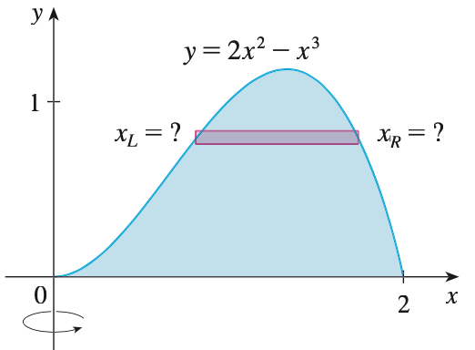 이제 드디어 저희가 처음에 구하고자 했던 회전체의 부피를 구할 수 있습니다. $y = 2x^{2} - x^{3}$이고 $y = 0, x = 0, x = 2$로 둘러쌓인 영역을 $y$축을 중심으로 회전했을 때 얻는 회전체의 부피는 아래와 같습니다.