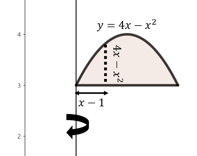 주어진 함수로 둘러쌓인 영역을 그림으로 그리면 위와 같이 그릴 수 있다. 여기서, 점 $x$에서 $x = 1$축을 기준으로 회전했을 때 얻을 수 있는 회전체 단면의 높이는 $4x - x^{2}$이다. 이제, 구간 $1 \le x \le 3$에서 주어진 영역을 $x = 1$축으로 회전시켰을 때 얻을 수 있는 회전체의 부피를 실린더 방법을 이용해 다음과 같이 구할 수 있다.