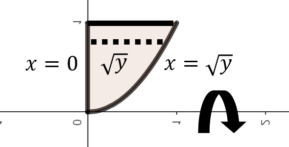 주어진 함수로 둘러쌓인 영역을 그림으로 그리면 위와 같이 그릴 수 있다. 여기서, 점 $y$에서 $x$축을 기준으로 회전했을 때 얻을 수 있는 회전체 단면의 높이는 $\sqrt{y}$이다. 이제, 구간 $0 \le y \le 1$에서 주어진 영역을 $x$축으로 회전시켰을 때 얻을 수 있는 회전체의 부피를 실린더 방법을 이용해 다음과 같이 구할 수 있다.
