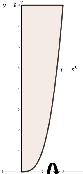 주어진 함수로 둘러쌓인 영역을 그림으로 그리면 위와 같이 그릴 수 있다. 여기서, 점 $y$에서 $x$축을 기준으로 회전했을 때 얻을 수 있는 회전체 단면의 높이는 $y^{\frac{1}{3}}이다. 이제, 구간 $0 \le y \le 8$에서 주어진 영역을 $x$축으로 회전시켰을 때 얻을 수 있는 회전체의 부피를 실린더 방법을 이용해 다음과 같이 구할 수 있다.