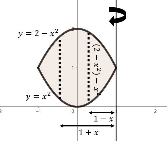 주어진 함수로 둘러쌓인 영역을 그림으로 그리면 위와 같이 그릴 수 있다. 여기서, 점 $x$에서 $x = 1$축을 기준으로 회전했을 때 얻을 수 있는 회전체 단면의 높이는 $(2 - x^{2}) - x^{2} = 2 - 2x^{2}$이다. 이제, 구간 $-1 \le x \le 1$에서 주어진 영역을 $x = 1$축으로 회전시켰을 때 얻을 수 있는 회전체의 부피를 실린더 방법을 이용해 다음과 같이 구할 수 있다.