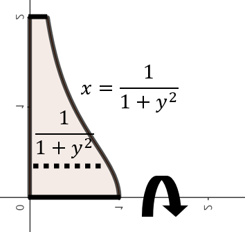 따라서, $x = \frac{1}{1 + y^{2}}, y = 0, y = 2$으로 둘러쌓인 영역을 $x$축을 중심으로 회전한 회전체의 부피를 의미한다.