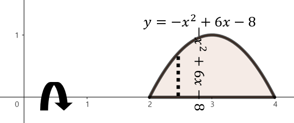 주어진 함수로 둘러쌓인 영역을 그림으로 그리면 위와 같이 그릴 수 있다. 여기서, 점 $x$에서 $x$축을 기준으로 회전했을 때 얻을 수 있는 회전체 단면의 반지름은 $-x^{2} + 6x - 8$이다. 이제, 구간 $2 \le x \le 4$에서 주어진 영역을 $x$축으로 회전시켰을 때 얻을 수 있는 회전체의 부피를 다음과 같이 구할 수 있다.