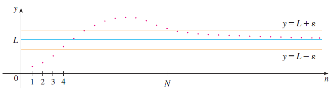 임의의 양수 $\epsilon > 0$에 대해서 $n > N$일 때 $\left|a_{n} - L\right| < \epsilon$을 만족하는 자연수 $N$이 존재한다면 수열 $\{a_{n}\}$의 극한 $L$이 존재하고 $\lim_{n \rightarrow \infty} a_{n} = L$로 작성한다.