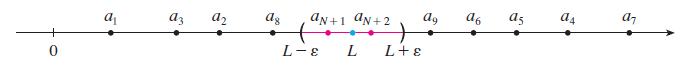 처음 그림으로 한번 더 보시면 $n$이 충분히 커지면 어느 순간 $L$이 $\left(a_{n} - \epsilon, a_{n} + \epsilon\right)$ 사이에 있도록 만들 수 있기 때문에 해당 수열이 수렴한다는 것을 알 수 있습니다.