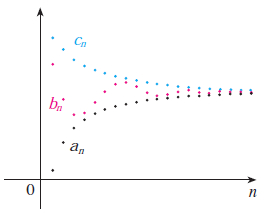 샌드위치 정리를 그림으로 그려보면 위와 같이 그릴 수 있습니다. $b_{n}$은 두 수열 $a_{n}$과 $c_{n}$ 사이에 껴서 점점 한 곳으로 수렴하는 것을 볼 수 있습니다.