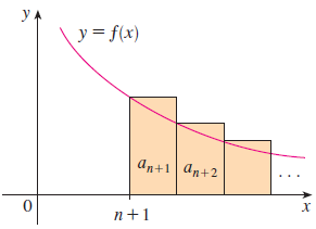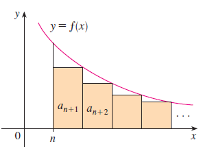 다음으로 위 그림을 보시면 $x = n$에서 시작해서 각 구간의 왼쪽점을 표본점으로 삼았습니다. 따라서, $R_{n} = a_{n + 1} + \cdots \le \int_{n}^{\infty} f(x) \; dx$입니다.