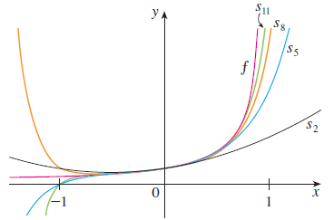 실제로 $f(x) = \frac{1}{1 - x}$와 $s_{n} = \sum_{i = 0}^{n} i^{n}$을 동일한 그래프에 그려보면 위와 같은 관계성을 볼 수 있습니다. $n$이 점점 커질수록 $s_{n}$이 $f$의 개형과 유사해지는 게 됩니다. 즉, 함수를 멱급수로 표현한다는 것은 복잡한 함수를 단순한 다항식의 무한합으로 근사한다는 것을 의미합니다.