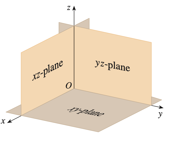 기본적으로 3차원 좌표계는 위와 같이 이루어져 있습니다. 일단, 원점(origin point) $O$가 있습니다. 2차원 좌표계에서와 마찬가지로 기준점의 역할을 하게 됩니다. 그리고 원점을 기준으로 뻗어나가는 3개의 좌표 축(coordinate axis) $x, y, z$를 볼 수 있습니다. 이 역시 2차원 좌표계와 마찬가지입니다. 다만, 다른 점은 지금까지 2차원 좌표계에서는 $x$와 $y$로만 정의하여 높이에 대한 정의를 할 수 없었습니다. 하지만, 3차원 좌표계에서는 $z$축을 도입함으로써 높이를 표현할 수 있고 이는 곧 입체를 대수적으로 표현할 수 있음을 의미합니다. 그리고 2개의 좌표계로 구성되는 평면(plane)이 존재합니다. 각각 $xy$-평면, $yz$-평면, $zx$-평면입니다.