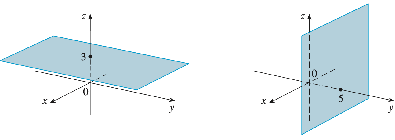 3차원 좌표계에서 점의 위치를 어떻게 정의하는 지까지 알아보았으므로 이번에는 3차원에서 간단한 대수방정식이 어떤식으로 그려지는 지 보도록 하겠습니다. 왼쪽 그림은 $z = 3$의 그래프를 3차원으로 보여주고 있습니다. 잘 보시면 $x$와 $y$의 값에 관계없이 $z = 3$인 조건만 만족하며 쭉 뻗어있는 것을 볼 수 있습니다. 오른쪽 그림도 마찬가지로 $y = 5$라는 제한만 존재하기 때문에 $x$와 $z$의 값에 관계없이 평면이 생성되는 것을 볼 수 있습니다.